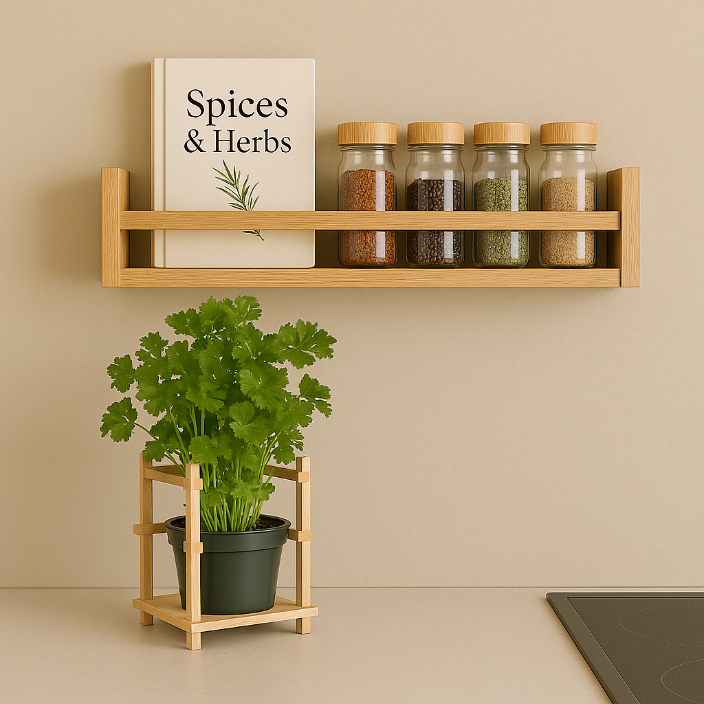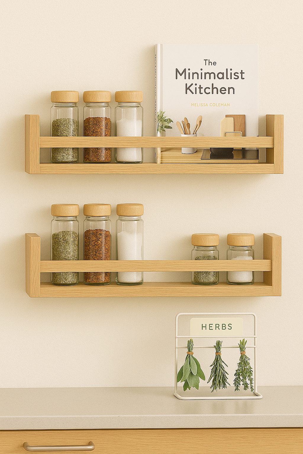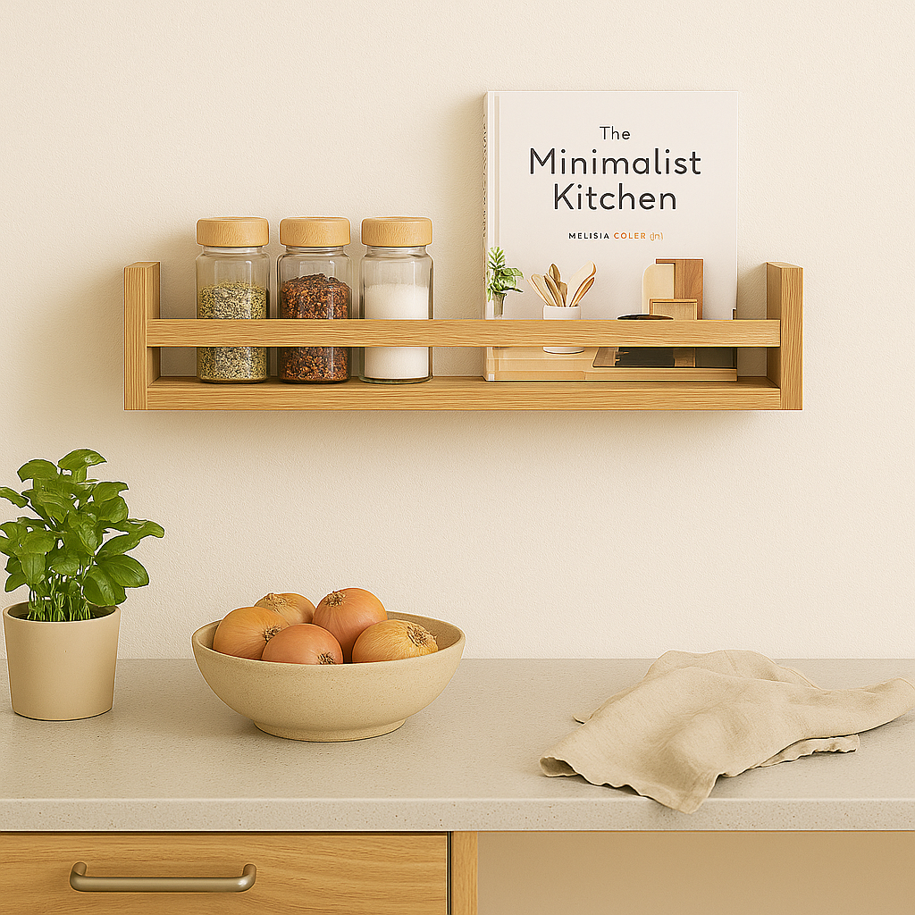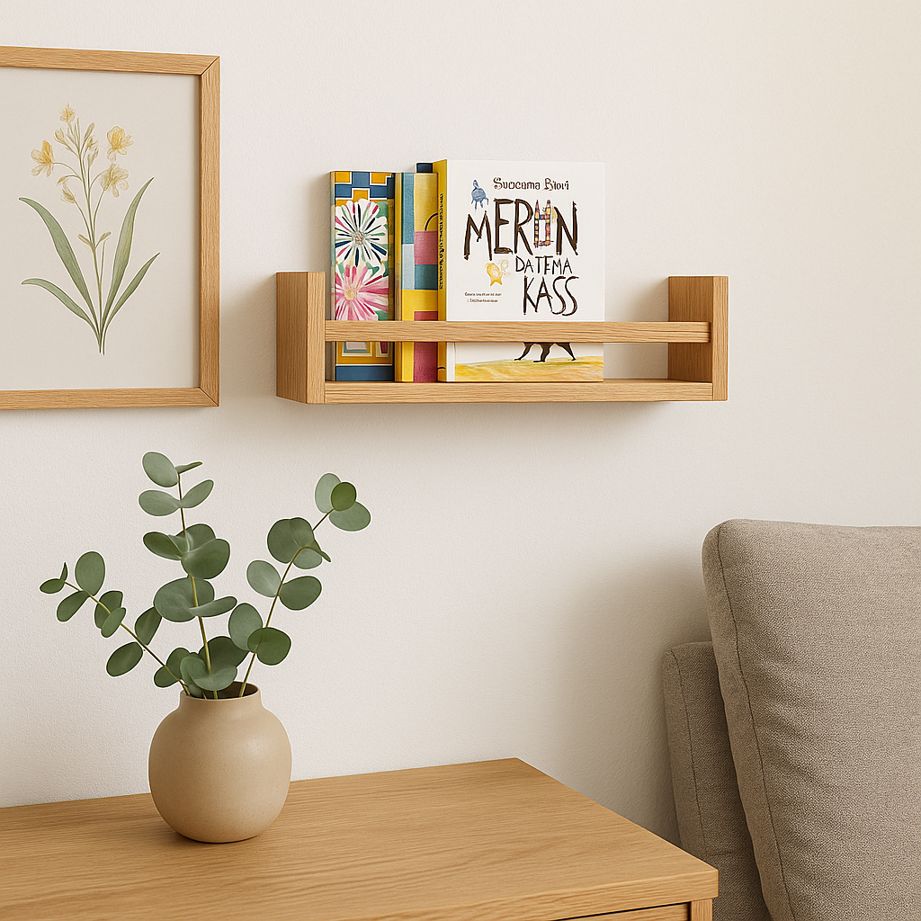 Minimalistlik ja naturaalne riiul raamatute, ajakirjade või väikeste dekoratsioonide esitlemiseks.